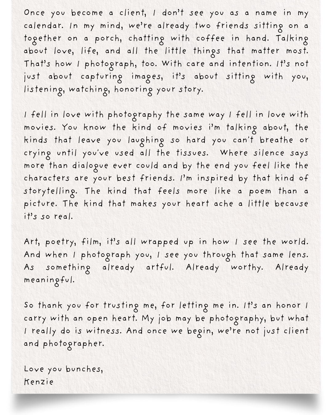I make space for emotion, for laughter, for being awkward together, for letting things unfold naturally. I want you to feel comfortable enough to relax and present enough to feel everything. I care deeply about the people I photograph, and I want us to genuinely connect. Most of the time, we leave feeling more like friends than client and photographer.