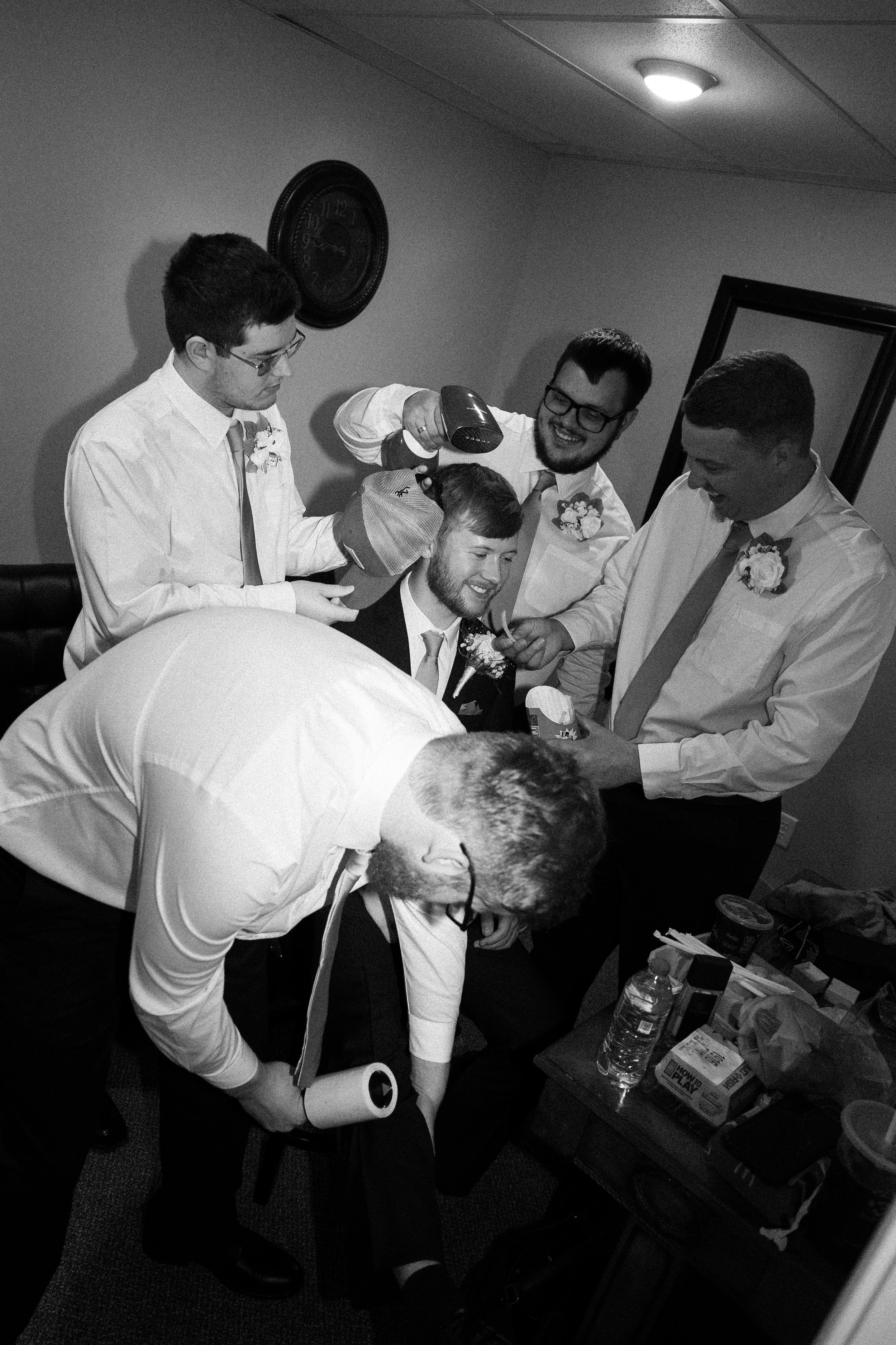 A late night jump into the lake after the reception, still in wedding clothes, ties loosened, heels kicked off.